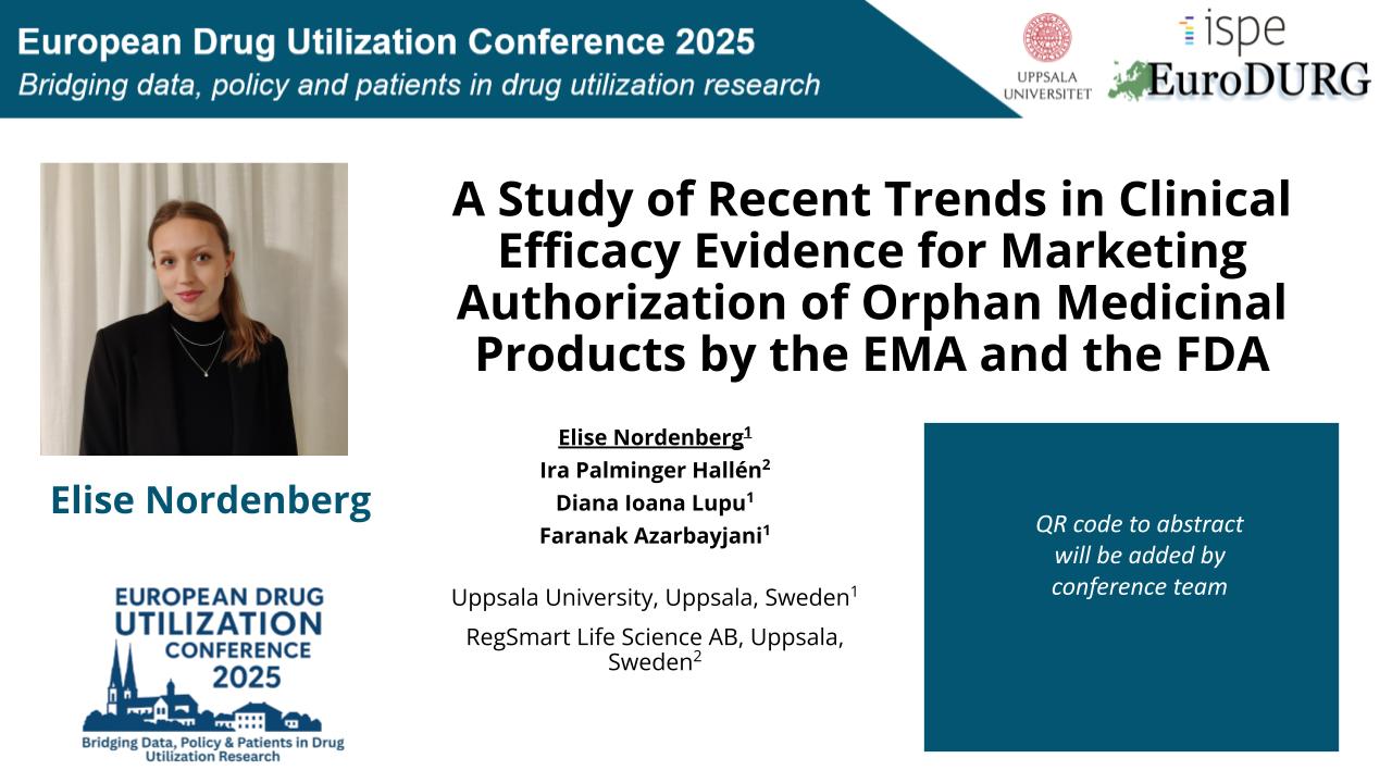 Early this summer, our former master’s thesis student Elise Nordenberg presented her project: “A Study of Recent Trends in Clinical Efficacy Evidence for Marketing Authorization of Orphan Medicinal Products by the EMA and the FDA”